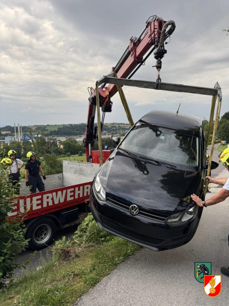Um 18:30 Uhr wurden wir zu einer Fahrzeugbergung in die Linzer Straße alarmiert. Die Lenkerin des PKW´s kam beim Zurücksetzen des PKW´s von der Fahrbahn ab. Dabei drohte das Fahrzeug auf die darunterliegende Landesstraße zu stürzen. Wir sicherten den PKW und hoben diesen mit unserem Ladekran auf die Fahrbahn zurück.