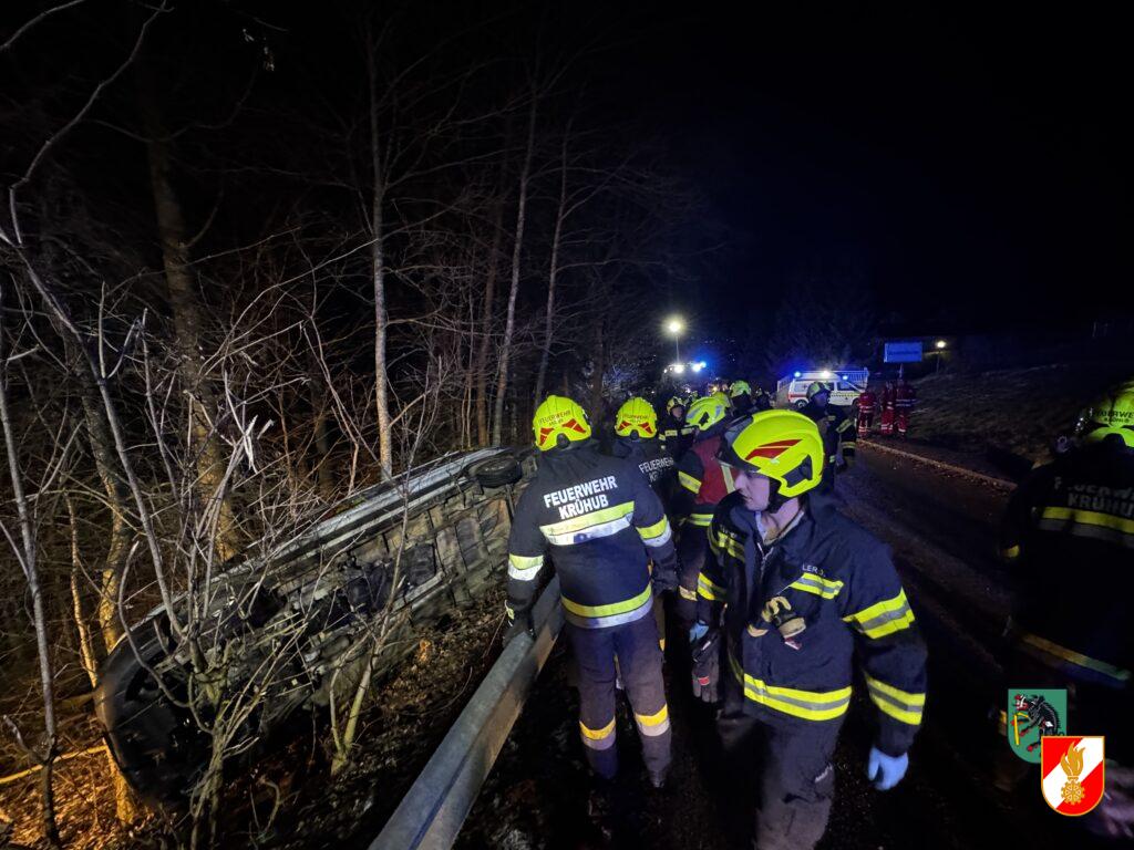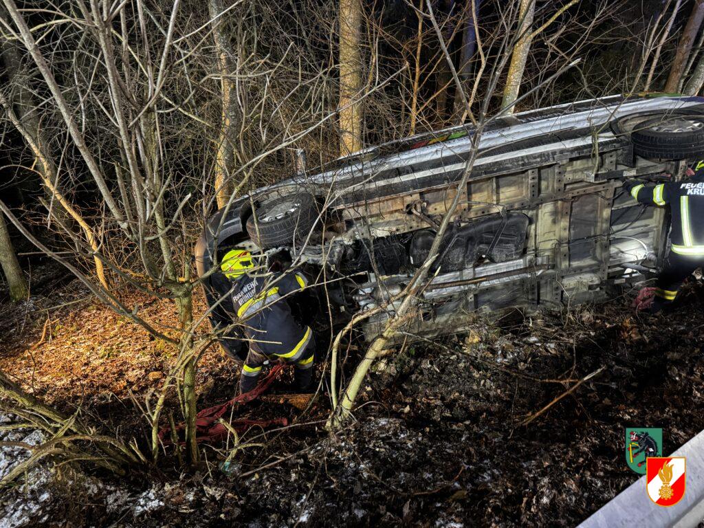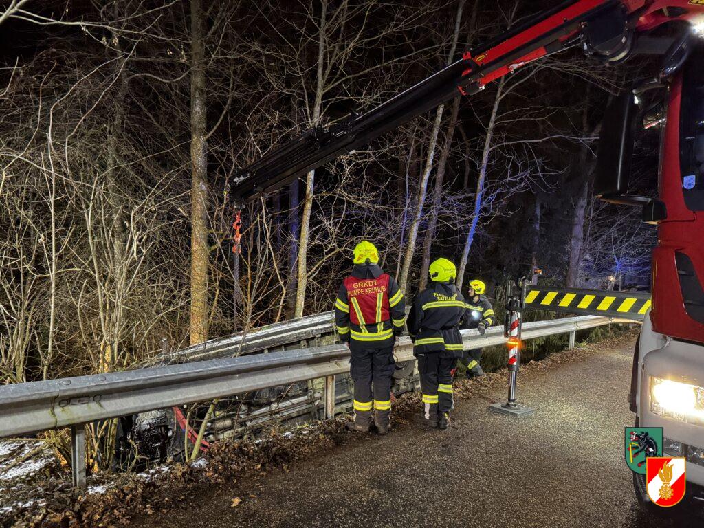 Der Lenker eines Kleintransporters hat aus unbekannten Gründen auf der Guntendorfer Landesstraße im Bereich des Gustermairbergs die Kontrolle über sein Fahrzeug verloren, fuhr auf die Leitschiene auf und stürzte hinter der Leitschiene in das angrenzende, steil abfallende Waldstück.