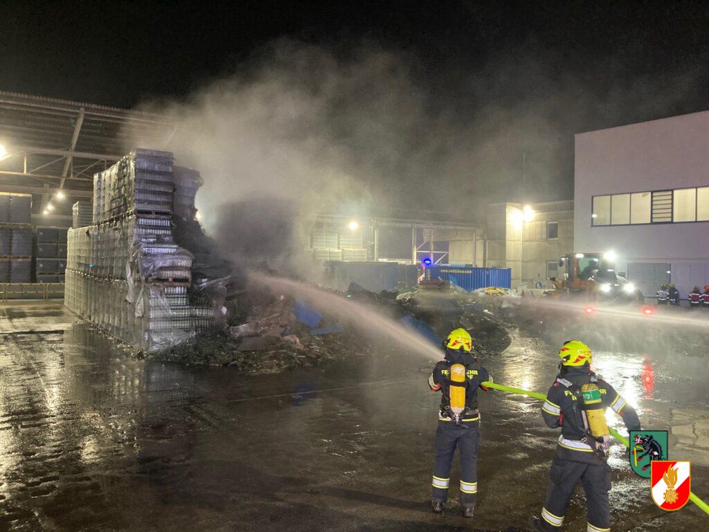 Speziell in der Anfangsphase machte die starke Rauchentwicklung den Einsatz von schwerem Atemschutz an den Strahlrohren notwendig, daher wurden drei weitere Feuerwehren, Ried im Traunkreis, Rohr im Kremstal und das Atemschutzfahrzeug Kirchdorf nachalamiert. Gegen 03:00 Uhr war die Lage so weit überschaubar, dass nach Rücksprache mit dem Firmenpersonal unsere Einsatzkräfte schrittweise zurückgenommen werden konnten, Einsatzende war schließlich gegen 06:00 Uhr. Die Brandursache ist derzeit noch nicht bekannt, Gefahr für die Mitarbeiter bestand zu keinem Zeitpunkt. Im Einsatz befanden sich 6 Feuerwehren mit ca. 85 Mann