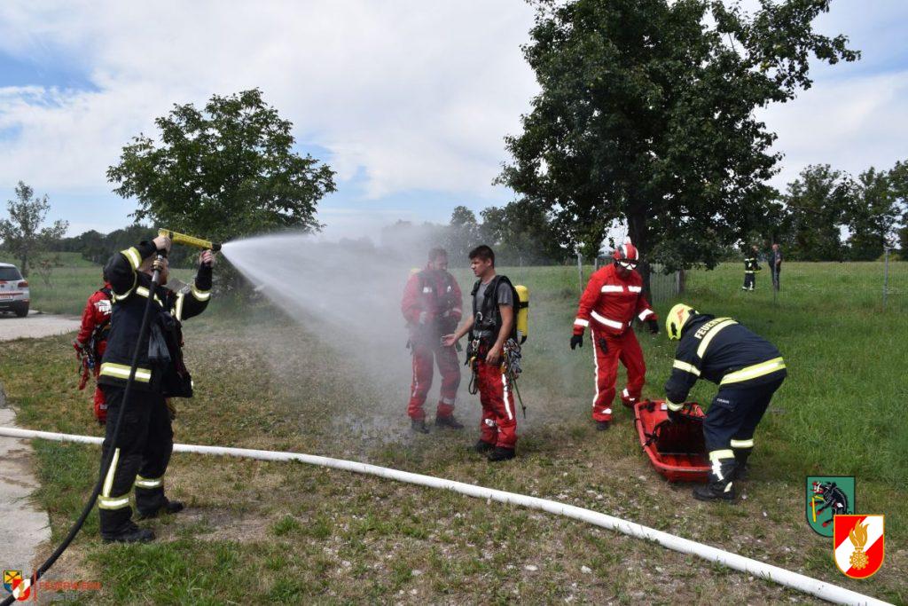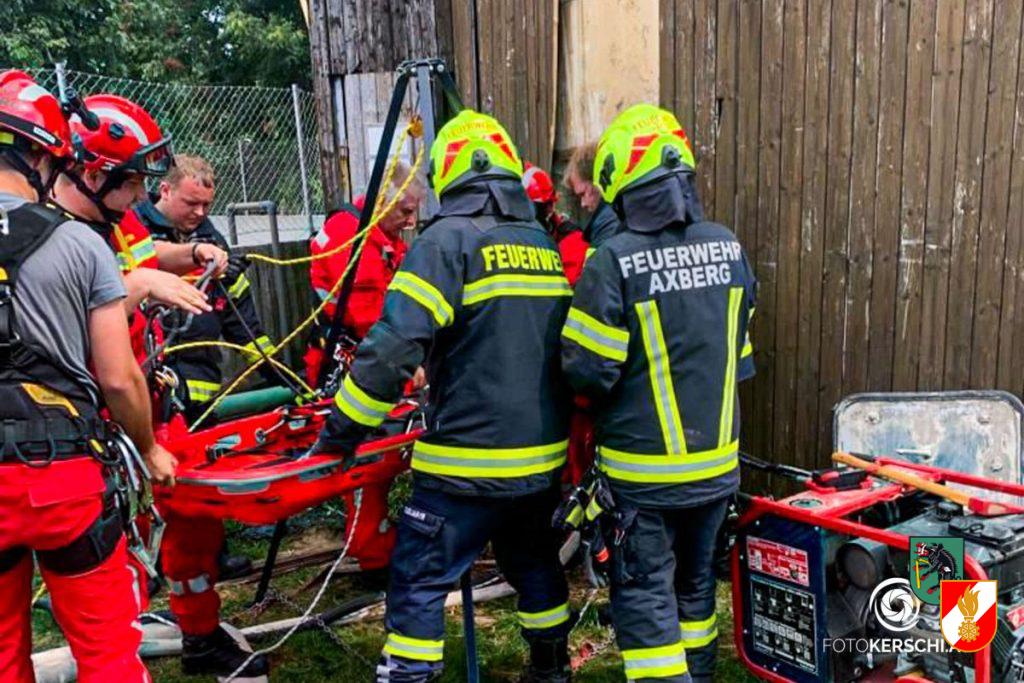 Am 12. August 2022, um 11:17 Uhr, wurden die Höhenretter der Feuerwehr Irndorf vom Höhenretterstützpunkt der Feuerwehr Axberg zu einer Personenrettung aus einer Biogasanlage in Pucking nachalarmiert. Für die alarmierten Einsatzkräfte stellte sich folgende Lage dar. Zwei bewusstlose Personen befanden sich im Schacht der Biogasanlage in ca. 4 Metern Tiefe. Der Zugang war nur über ein sehr schmales Mannloch möglich, welches zusätzlich noch teilweise mit einer Holztäfelung verschalt war. Diese wurde von der erstalarmierten Feuerwehr Pucking-Hasenufer entfernt. Als Erstmaßnahme wurde ein Atemschutzträger in die Grube abgelassen und die bewusstlosen Personen erstversorgt, sowie die Biogasanlage druckbelüftet. Die darauffolgend eintreffenden Höhenretter der FF Axberg stiegen dann mit insgesamt drei Höhenrettern unter Atemschutz ab und versorgten die Verletzten mit Atemluft. Die nachrückenden Höhenretter der FF Irndorf unterstützten dann die Kameraden von Axberg bei der Menschenrettung. Mit Hilfe der Korbschleiftrage und einer Akkuwinde konnten so nacheinander zuerst der Mann und dann die Frau aus der Biogasanlage gerettet werden. Die zwei Personen wurden den Notärzten zur weiteren Versorgung übergeben und anschließend mit dem Rettungshubschrauber bzw. Rettungswagen in umliegende Krankenhäuser gebracht.