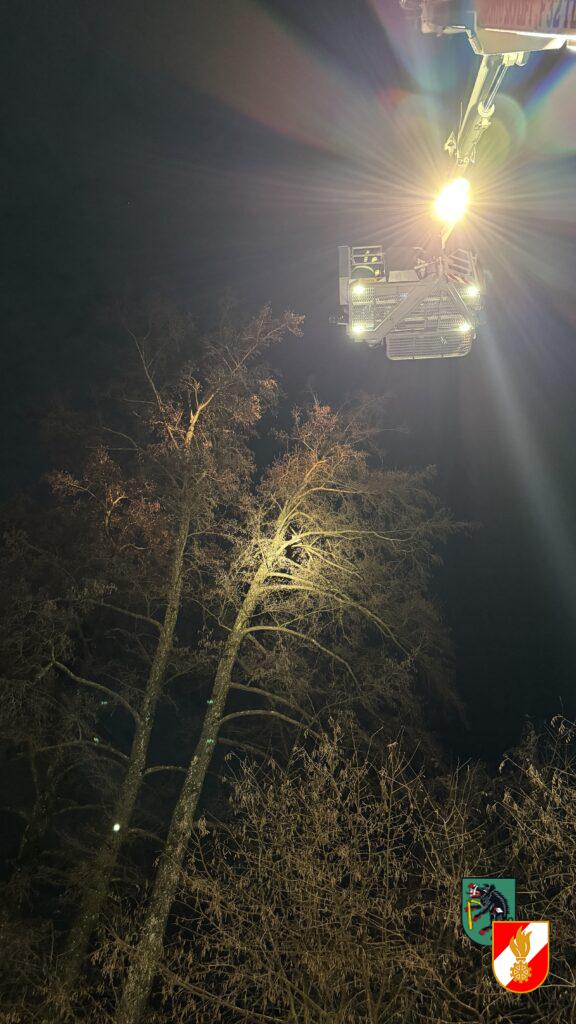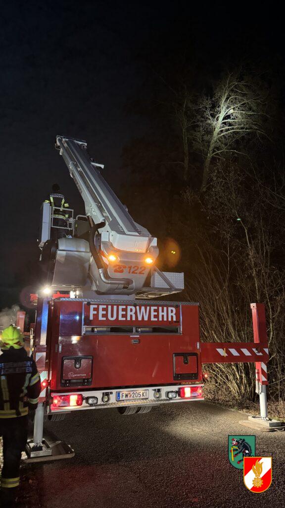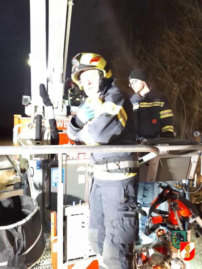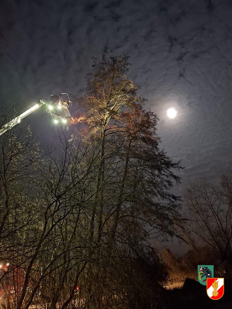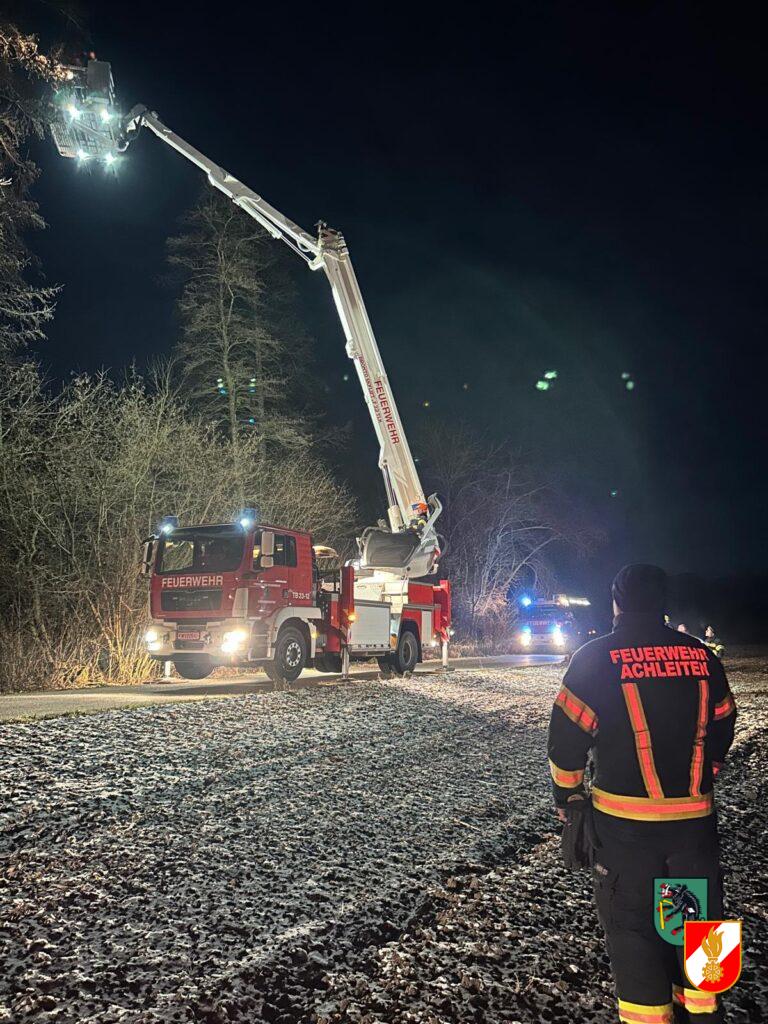 Am 13.01.2025 unterstützten wir die Feuerwehr Achleiten bei einer Tierrettung mit unserem Hubrettungsfahrzeug. Eine Katze hatte sich mit einer Leine am Baum verhängt und musste aus ca. 16 Meter Höhe gerettet werden.