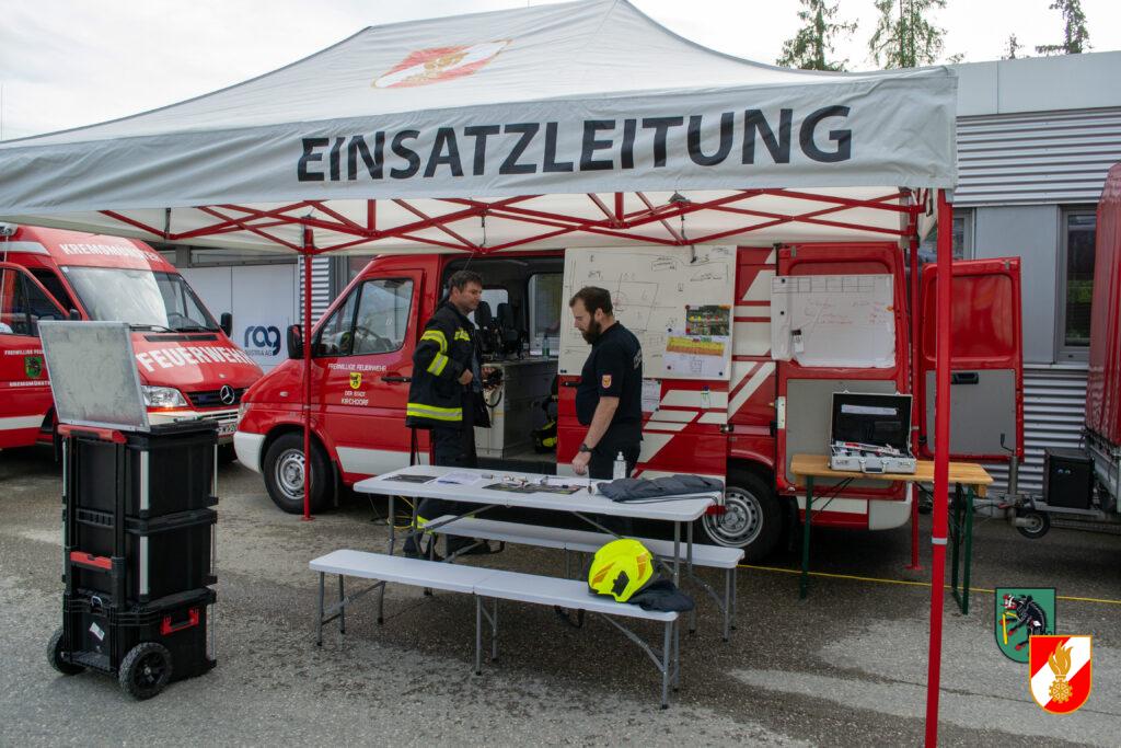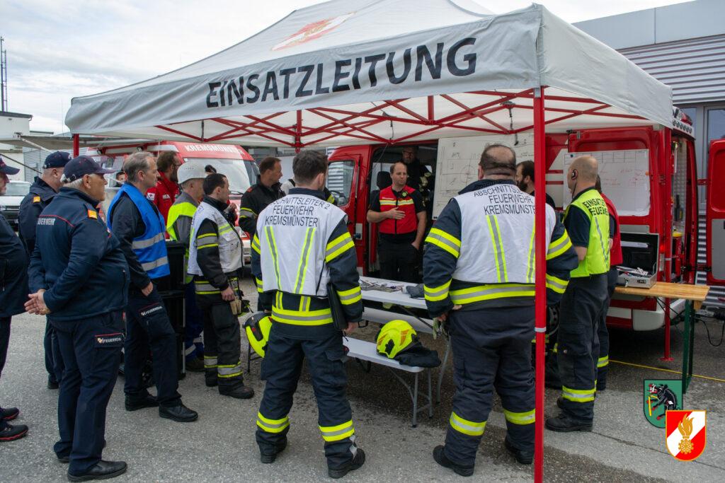 Unabhängig der Löscherfolge durch die stationären Löschsysteme wurde ein umfassender Einsatz durch die anrückenden Feuerwehren gestartet. Die Einsatzleitung wurde gegenüber dem Tanklager beim Zentralengebäude eingerichtet. Die vier im Sonderalarmplan definierten Einsatzabschnitte wurden von den Fahrzeugen der Feuerwehren des Pflichtbereichs Kremsmünster besetzt. Ein reger Befehls- und Informationsaustausch zwischen den Abschnitten und der Einsatzleitung wurde durch zwei Funker in der Einsatzleitung durchgeführt.