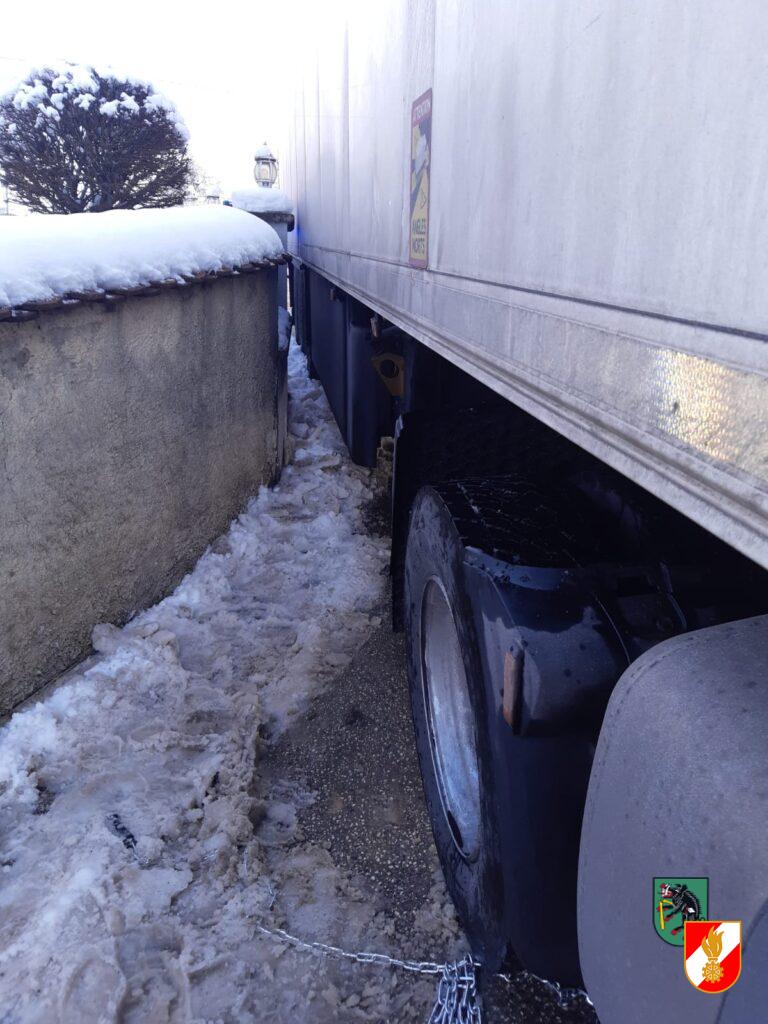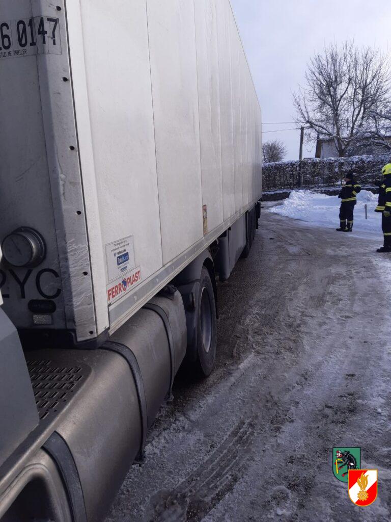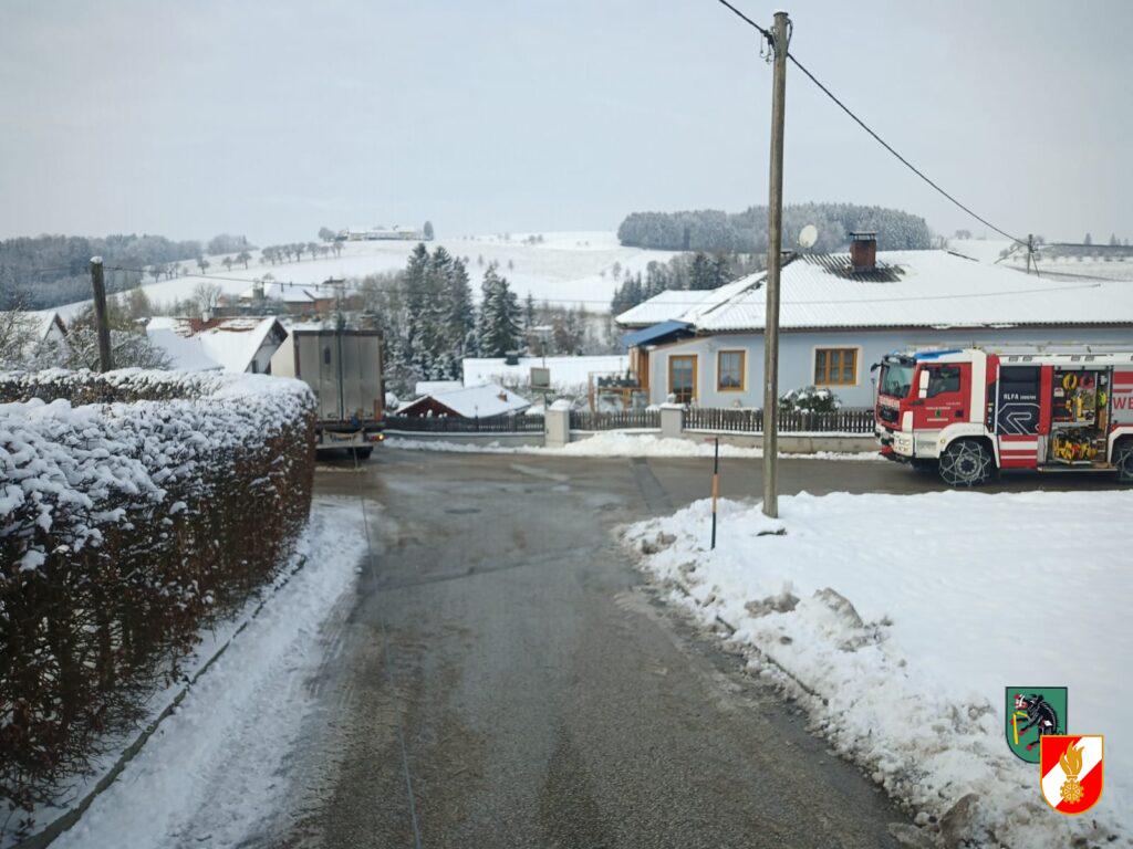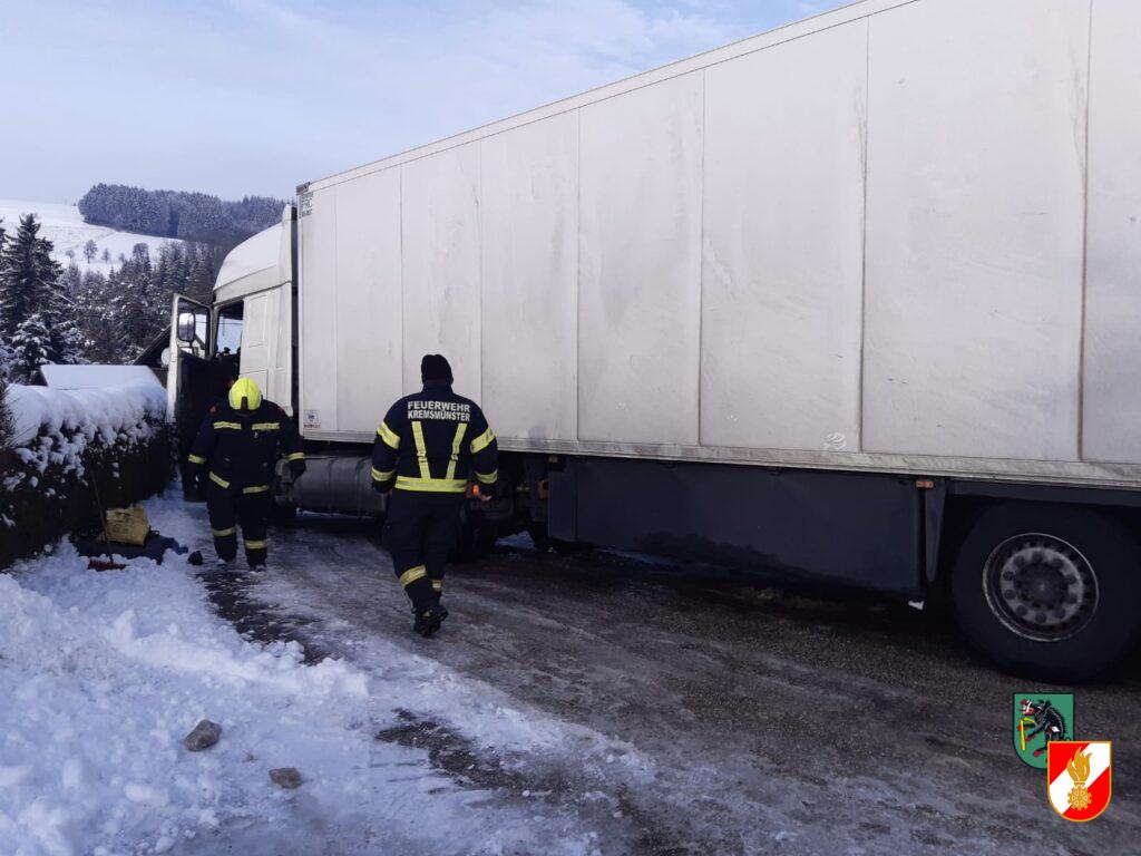 Am 19.12.2022 wurde die Feuerwehr Kremsmünster zu einer LKW-Bergung am Strasserbauerberg alarmiert. Der Lenker des Sattelzugs wurde durch sein Navi irrgeleitet. Beim Versuch umzudrehen blieb er auf der schneeglatten Fahrbahn hängen. Mit Hilfe der Seilwinde am Löschfahrzeug konnte das Fahrzeug geborgen werden.