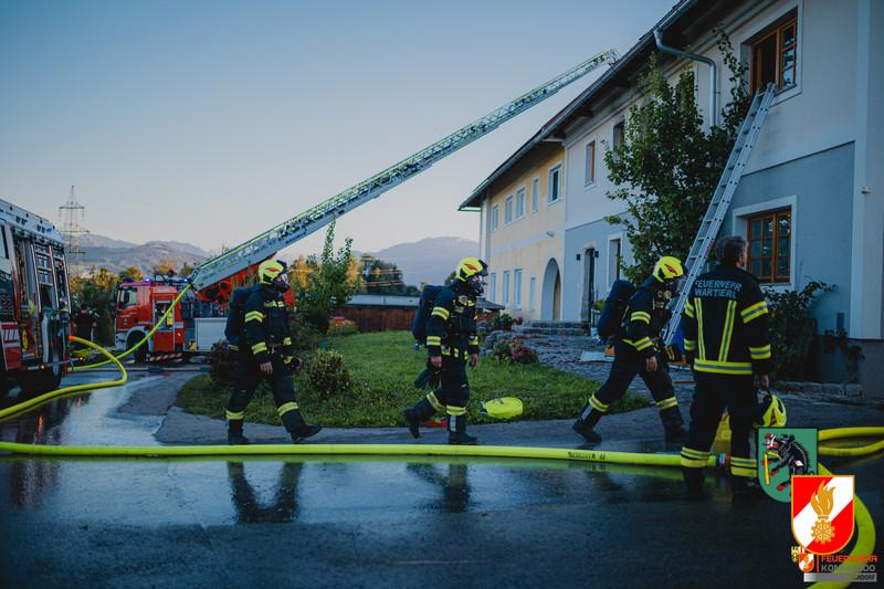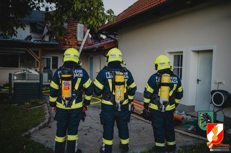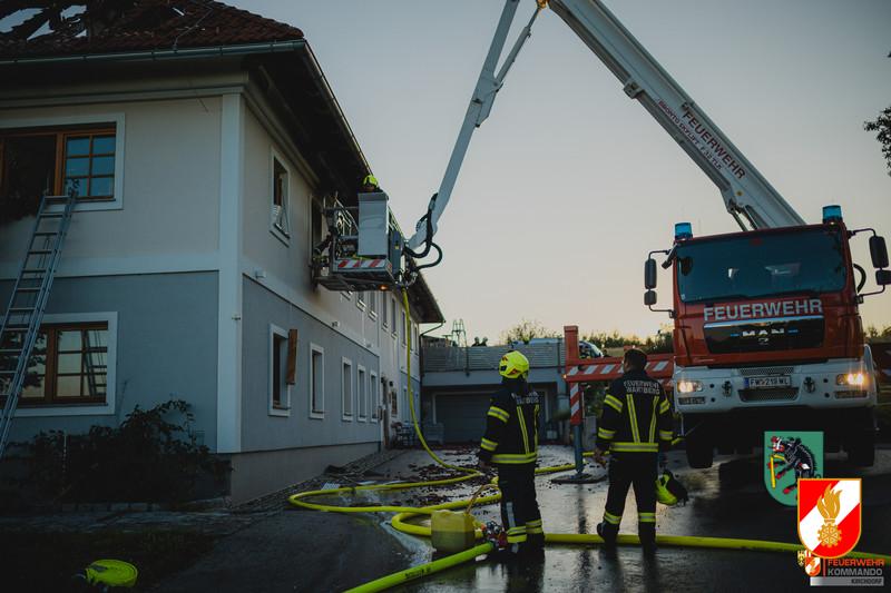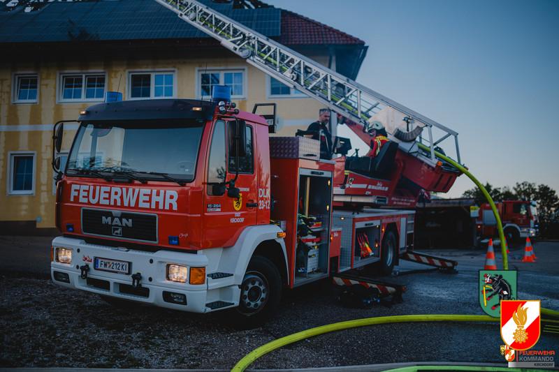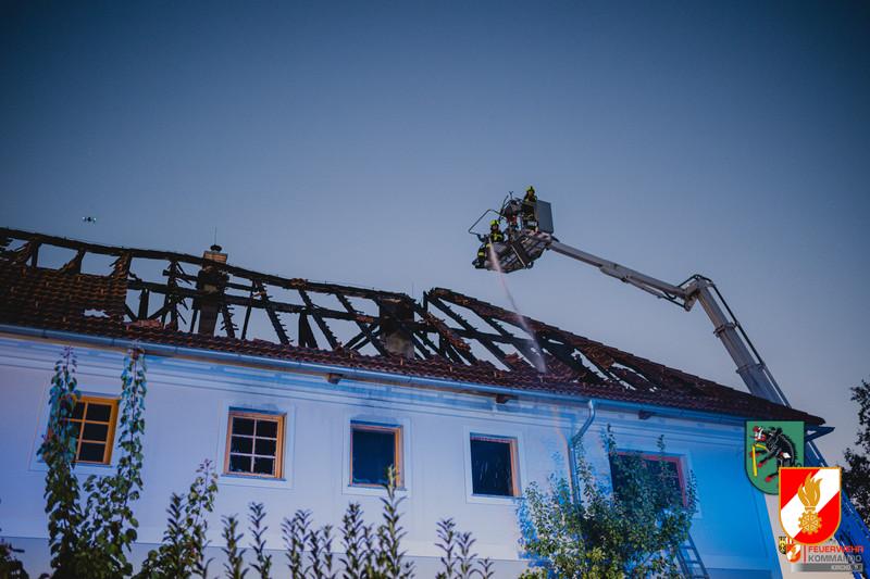 Beim Eintreffen der Kräfte bot sich folgendes Bild: Der Dachstuhl eines Vierkanters war in Vollbrand. Im Bereich des Wohntraktes war ein offener Dachstuhlbrand ersichtlich. Im Dachbereich des hinteren Wirtschaftstraktes, wo unteranderm eine Bäckerei untergebracht ist, quoll dicker Rauch aus der Dachdeckung. Die Erstmaßnahme war das schützen des Zubaus. Mit den weiteren eintreffenden Kräften wurde sukzessive ein umfassender Löschangriff aufgebaut. Durch die örtlich große Ausbreitung des Brandes am gesamten Dachstuhl wurde nur knapp eine halbe Stunde nach der Erstalarmierung die Alarmstufe 3 ausgelöst. Immer wieder auflodernde Glutnester und der Wind erschwerten die Löscharbeiten. Um alle Glutnester und die letzten lokalen Brände abwehren zu können wurden mehrere Hubrettungsgeräte nachalarmiert. Noch nicht abgebrannte Bereiche in denen sich jedoch Glutnester befanden wurden mittels Motorsägen geöffnet und unter schweren Atemschutz abgelöscht.