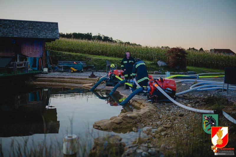 Zwei Wasserentnahmestellen, ein Schwimmteich neben dem Brandobjekt und ein offener Löschwasserbehälter, fungierten zu Beginn als Löschwasserentnahmestelle. Insgesamt wurde mit neun Tragkraftspritzen das Wasser zum Brandobjekt befördert.