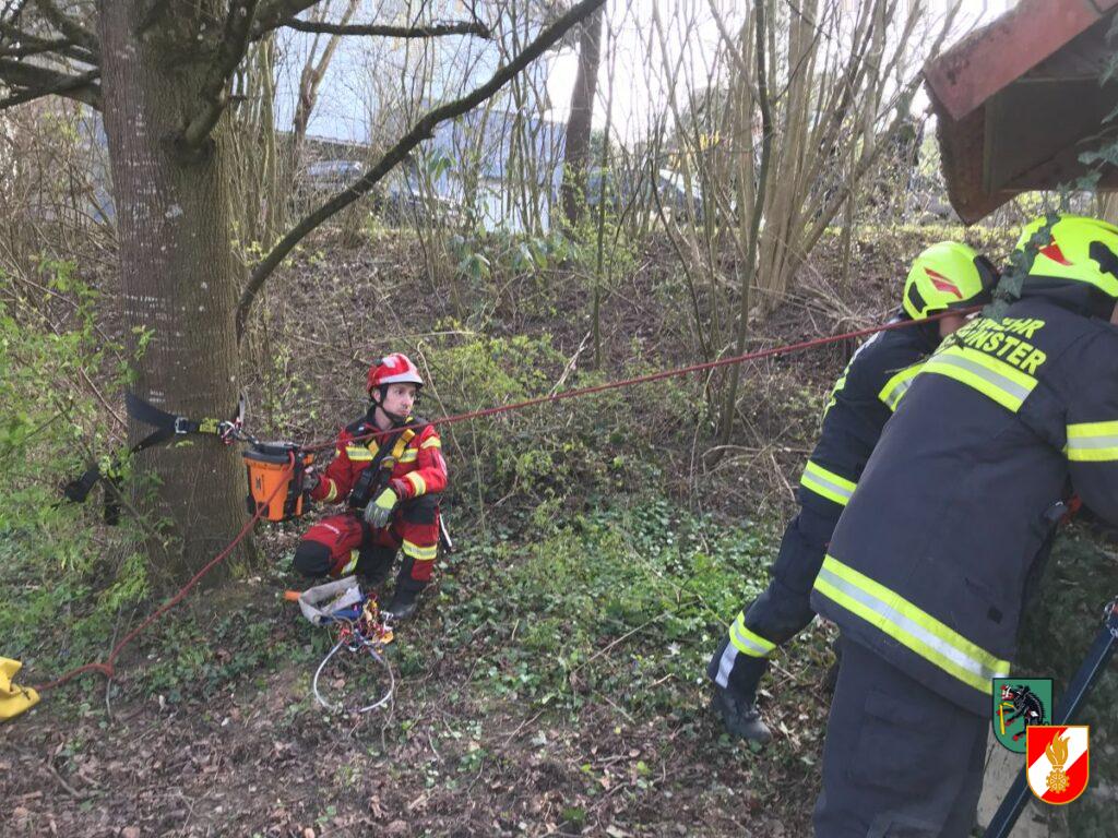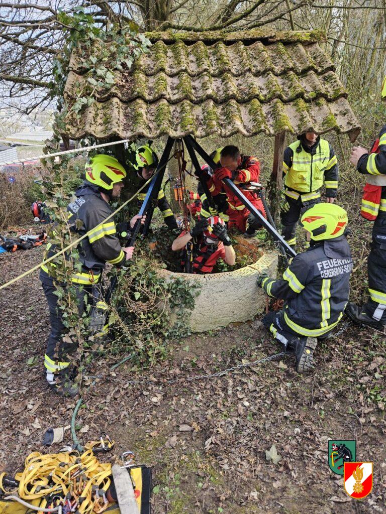 Am 19. März um 14:57 Uhr wurde der Höhenretterstützpunkt der Feuerwehr Irndorf gemeinsam mit dem Stützpunkt der Feuerwehr Eberstalzell und der TMB der Feuerwehr Kremsmünster zur Unterstützung der Feuerwehren Kematen an der Krems und Gerersdorf-Schachen bei einer Personenrettung in der Gemeinde Kematen an der Krems alarmiert. Ein Mann hatte sich vermutlich zum Ausruhen auf eine Brunnenabdeckung gesetzt, als diese brach stürzte er ca. 8 bis 10 Meter in den Brunnen. Ersthelfer seilten ein Leiternstück zum Verunglückten ab, so dass sich dieser über Wasser halten konnte. Seitens der Höhenretter Irndorf wurde ein Retter zum Verunfallten abgelassen und von ihm zur Rettung vorbereitet. Im Anschluss wurden die Beiden gemeinsam mit Hilfe der erst kürzlich vom Landeskatastrophenschutz zur FF Irndorf verlagerten Elektrowinde aus dem Brunnen gezogen. Durch die perfekte Zusammenarbeit aller Einsatzkräfte konnte der Verletzte rasch gerettet und dem Notarzt zur Erstversorgung übergeben werden.